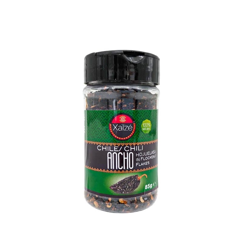 Torkade chiliflakes av den mexikanska chilifrukten ancho. Chile ancho bjuder på en djup och rökig smak och är en mångsidig ingrediens i det mexikanska köket i allt från chili con carne, enchiladas, molesås, adobosås, och så vidare. De används oftast tillsammans med chile guajillo och kompletterar varandra fint. Med dessa chiliflingor kan du enkelt tillsätta chilifruktens unika smakprofil och hetta. Prova tillsammans med tacokryddan nästa gång du lagar tacos hemma. 85g.