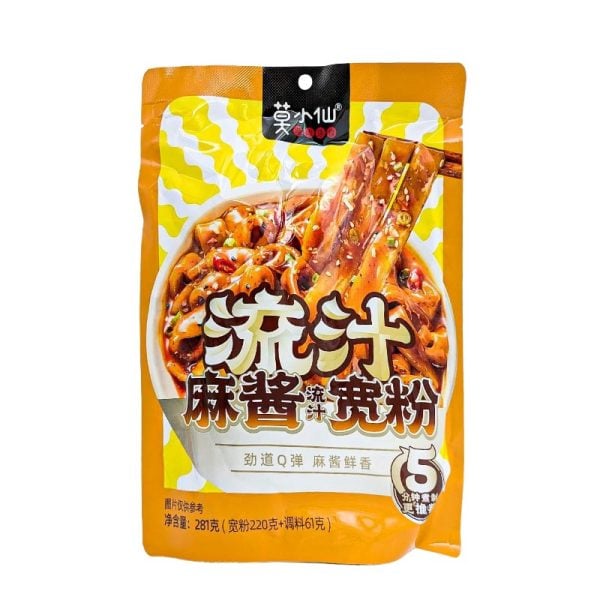 Breda potatisnudlar med massor smak och hetta. De är glasnudlar gjorda på en blandning av potatis–, tapioka– och majsstärkelse för att ge dem sin härliga spänst och tuggmotstånd. Här serveras de med en krämig och kryddig sesamsås som ger en härlig nötig arom och djup hetta. Resultatet är en snabblagad och mättande nudelrätt med perfekt “chewy” textur och en lyxigt krämig, nötigt umamirik sås. 281g.