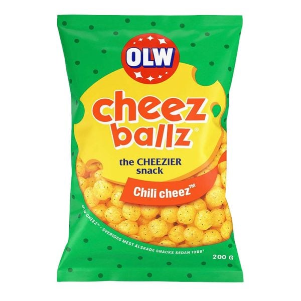OLW cheez ballz chili cheez är ett efterlängtat tillskott i den svenska snacksfamiljen cheez. Här har du kryddigt frasiga majsbollar med smak av ost och jalapeño. En ny smakfavorit med perfekt hetta. 200g.