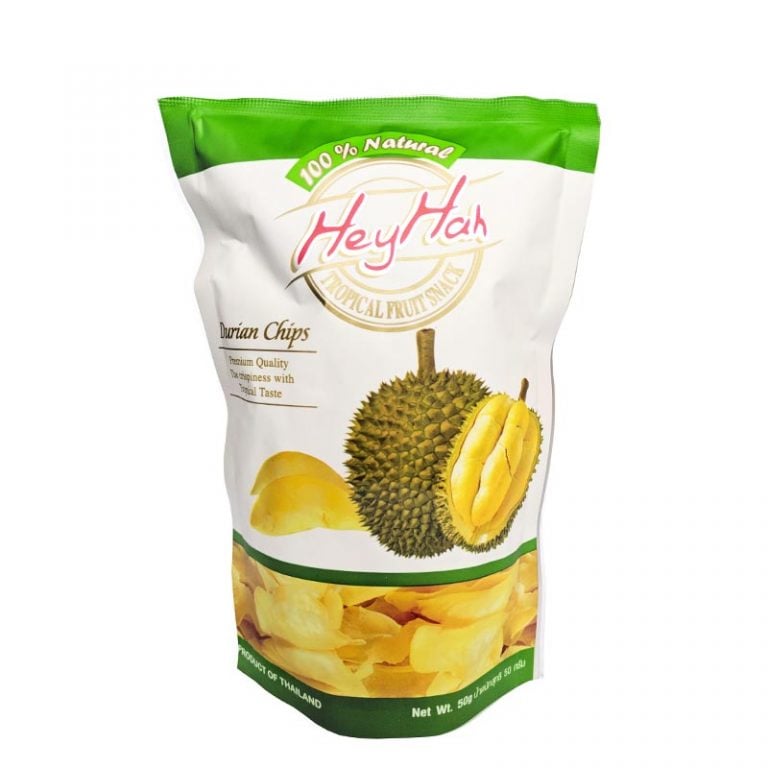 Durian är känd för sin minst sagt unika och egendomliga lukt och smak. Människor tycker sig finna alla möjliga smaker i frukten, men det enda dom är överens om är att den är otroligt speciell, påminner inte om något annat. Frukten är stor som vattenmelon och har skyddande gula taggar, fruktköttet är klart gult och det är precis här vi finner den pikanta doften. Prova dessa chips gjorda av durian med dina vänner! 50g.