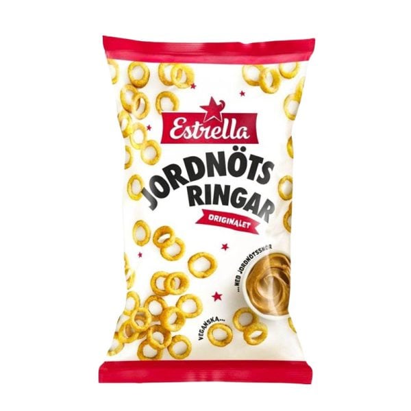 Jordnötsringar från svenska Estrella bjuder på en djup smak av jordnötter och ett härligt krisp. De är smaksatta med äkta jordnötssmör, och resultatet är ett snacks med en djup smak som skiner med varje tugga. 175g.