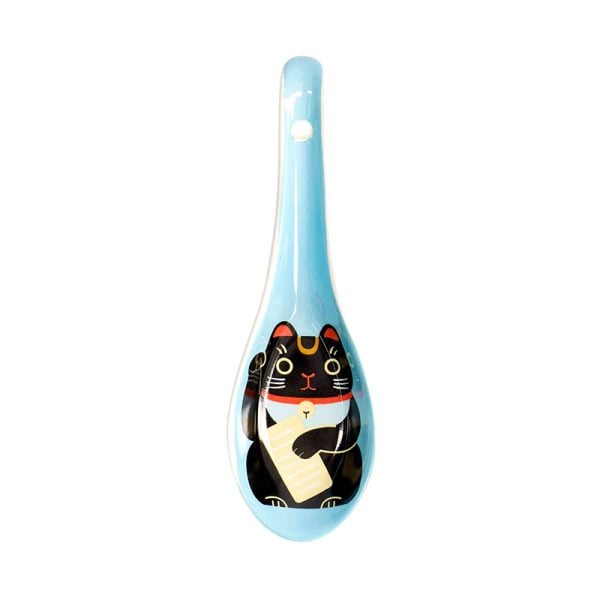 En jättesöt ramensked dekorerad med en svart Maneki Neko, den lyckobringande japanska katten. Fin blå färg som kontrasterar den svarta katten. Perfekt till hemmagjord ramen samt udon, och så klart snabbnudlarna. Mäter 13.8cm.