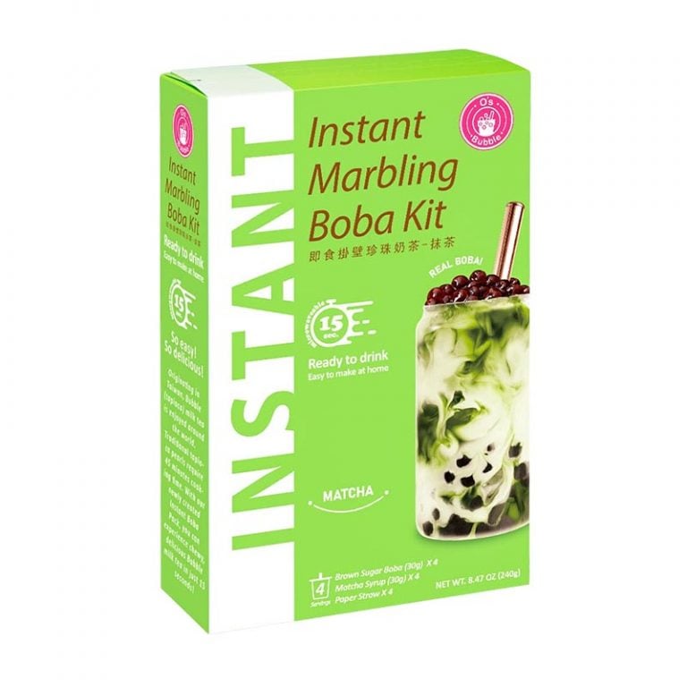 Ett nytt och enklare att göra hemmagjord bubble tea på! Med O’s Bubble Marbling Boba Kit får du fyra uppsättningar marbling sirap och tapiokapärlor för att göra egen bubbelte som ger en otroligt vacker yta på insidan av glaset. Använd den smaksatta marbling-sirapen för att glasera ditt glas eller din mugg innan du har i is (om du vill ha den kall!), boba och ditt val av mjölk. Så fort den är klar kommer du ha gjort den snyggaste bubble tea du sett, alldeles själv och hemma! Denna i smak av underbar matcha. Ingredienserna är veganska. Boba förbereds i mikrovågsugnen på bara 15 sekunder. Tydligare tillagningsinstruktioner finns på förpackningen. Innehåller fyra stycken paket sirap, fyra stycken paket tapiokapärlor och fyra sugrör, det vill säga tillräckligt för fyra uppsättningar hemgjord bubbelte. 240g.