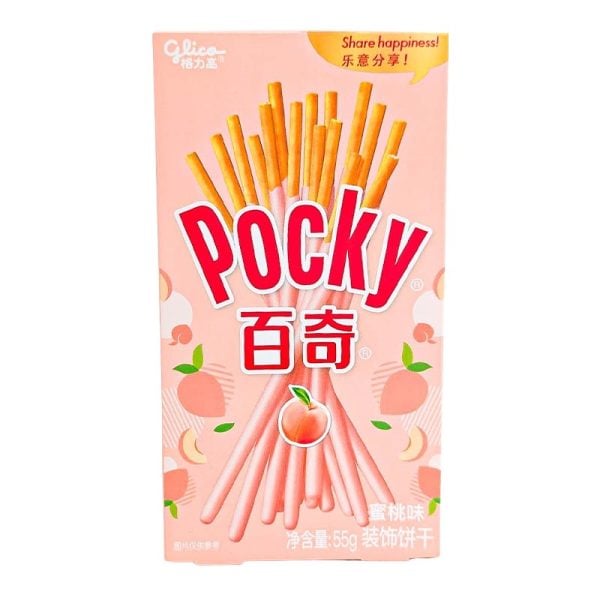 Smarriga och krispiga pinnar tillverkade först i Japan, Pocky! Snackspinnarna har gjort sig kända världen runt för sina spännande knapriga smaker. Just dessa kommer i en underbar smak av somrig persika. Goda att äta för sig själva som ett lättare och smakrikt snacks, men fungerar alldeles utmärkt som topping på glass eller andra efterrätter som behöver lite extra krisp. 50g.