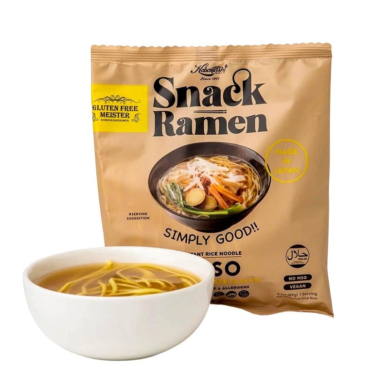 Kobayashi är ett japanskt företag från Gifu som med sitt märke Gluten Free Meister fokuserar på att tillverka autentisk smakande ramen utan gluten och animaliska produkter. Resultatet är fantastisk smakrika glutenfria och veganska ramen med en otrolig buljong och spänstiga risnudlar med lika fantastisk konsistens som vanliga ramennudlar. Med detta mindre pack snabbnudlar får du njuta av en riktigt umamirik och djup buljong smaksatt med miso – en klassisk japansk ramenbuljong! Nudlarna kokas i 5 minuter i 500ml vatten, sedan är det bara att ta bort från värmen och hälla i buljongen. Glöm inte att garnera med dina favoritingredienser för en mer komplett måltid, eller njut av den som den är för ett härligt och värmande mellanmål. 89g.