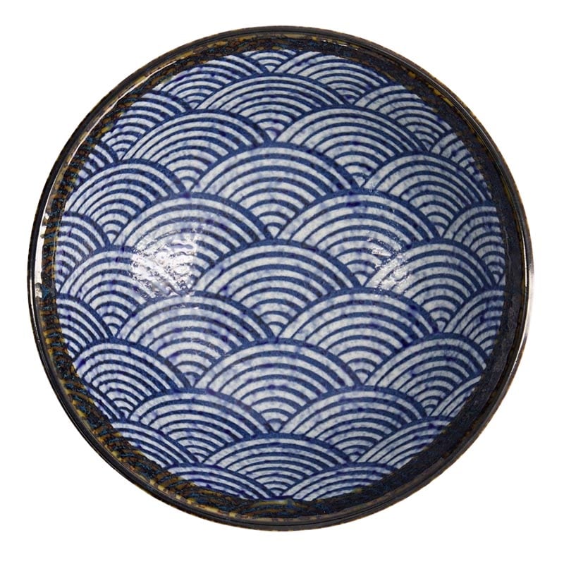 Vacker rustik ramenskål från Japan med det klassiska seigaiha-mönstret i blå och vit färgsättning. Namnet åsyftar de japanska vågorna som dekorerar många skålar och keramik i Japan. Läcker brun kant på skålen skapar en häftig kontrast. Mäter 21.5cm i diameter och rymmer 1300ml.