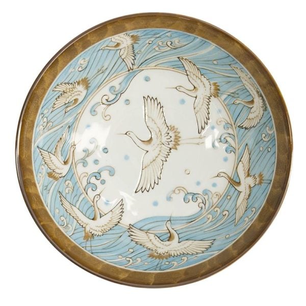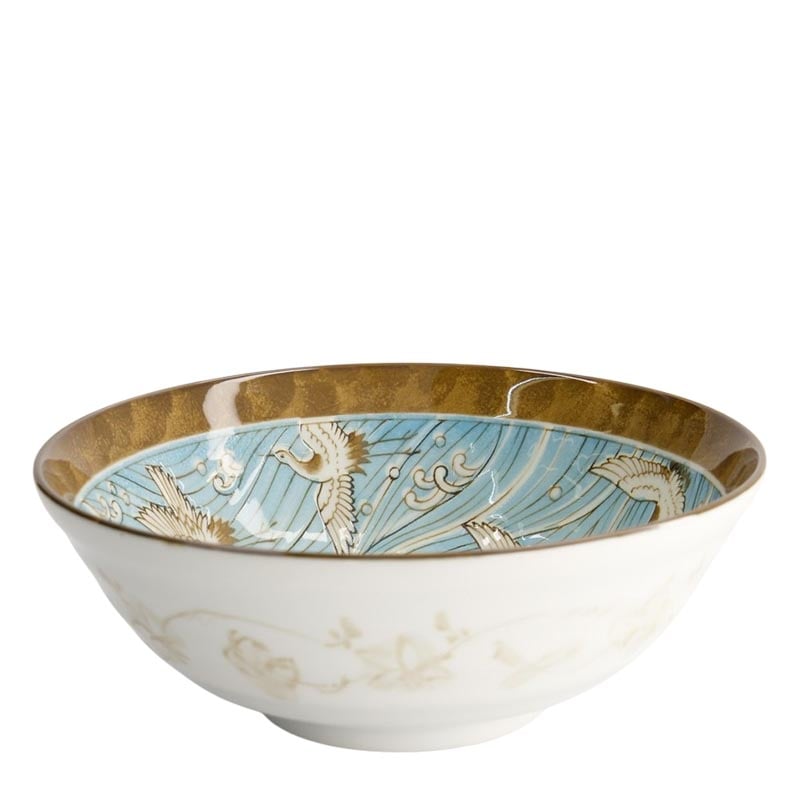 En otroligt vacker ramenskål från Japan i en mjuk färgsättning av vacker pastellblå och ljusbrunt. Insidan av skålen avbildar tranor, ett klassiskt japanskt porslinmotiv. Perfekt som gåva eller att servera hemmagjord ramen i. Mäter 21cm i diameter och rymmer 1000ml.
