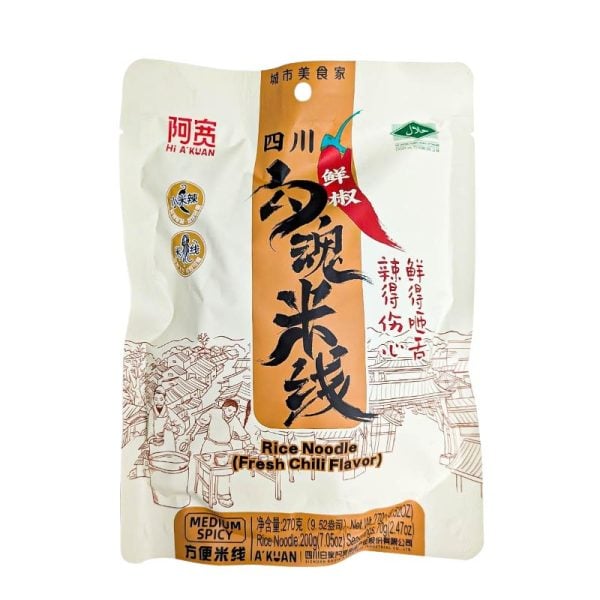 En värmande nudelsoppa med färsk chilismak från Sichuankökets aromatiska kök. Dessa snabblagade risnudlar från A’Kuan bjuder på en tydligt Sichuan-inspirerad smakprofil där färsk chili står i centrum. Nudlarna är mjuka, släta och med fint tuggmotstånd, och blandas med en aromatisk kryddbas som ger en frisk, pepprig och djup umamismak. Hettan är medelstark men rejäl nog för att ge den där klassiska Sichuan-känslan av värme och sting, samtidigt som chilins fräschör håller smaken balanserad. 270g.
