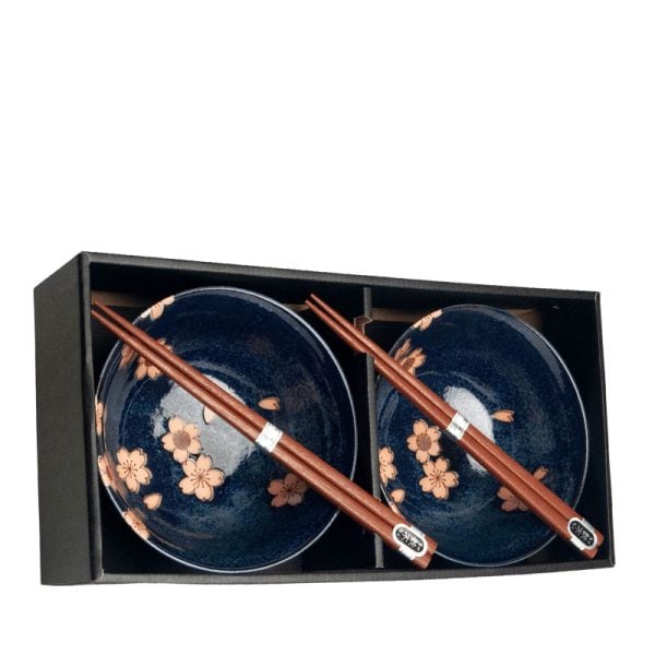 Fint skålset med tillhörande ätpinnar. Två stycken skålar i mindre storlek som mäter 15cm i diameter och är dekorerade med japanska blommor. En perfekt gåva för Japan– och matintresserade vänner eller familjemedlemmar (eller dig själv!). Setet kommer med två skålar och två par ätpinnar. Skålarna mäter 15cm i diameter.