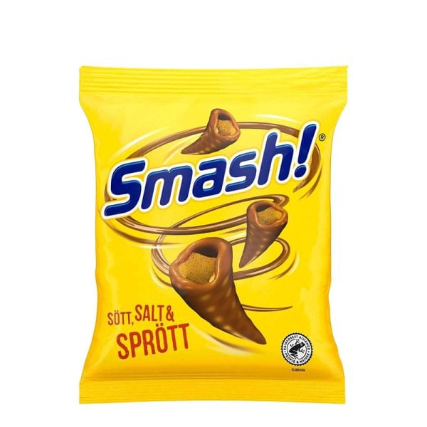 Ett av svenska OLWs senaste skapelser: Smash! Spröda majssnacks doppade i mjölkchoklad. Resultatet är en oemotståndlig kombination av sött, salt och sprött. 100g.
