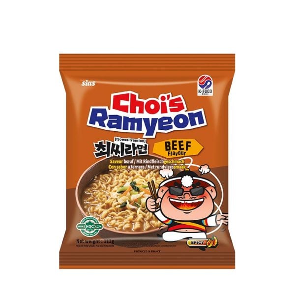 Prisvärda snabbnudlar från sydkoreanska Choi som tillverkar sina nudlar i Frankrike. Här bjuds det på klassiska ramyeon, det vill säga sydkoreansk snabbramen, i smak av biff. Värmande buljong och mild hetta. Perfekt när du snabbt och enkelt vill slänga ihop en måltid eller mellanmål. Glöm inte att garnera med ramenägg, hemmagjord chashu eller dina favoritoppingar. 113g.