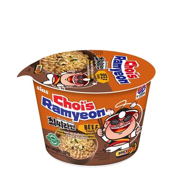 Prisvärda snabbnudlar från sydkoreanska Choi som tillverkar sina nudlar i Frankrike. Här bjuds det på klassiska ramyeon, det vill säga sydkoreansk snabbramen, i smak av biff. Värmande buljong och mild hetta. Kommer här i en praktisk bowl som du kan njuta av på skolan, jobbet eller hemma i en enkel förpackning. Glöm inte att garnera med ramenägg, hemmagjord chashu eller dina favoritoppingar. 107g.