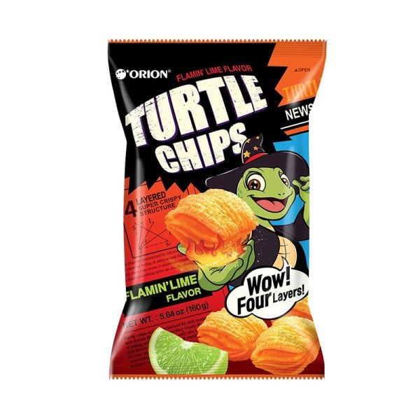 Sydkoreanska Orion är mästare på snacks, och med sina Turtle Chips – där de kombinerar flera lager av kex för att skapa en otroligt krispig textur som smälter i munnen – har de snabbt vuxit till att bli ett av Sydkoreas mest kända tilltugg. Denna variant bjuder på de karakteristika “turtle chips”, som ser ut som små sköldpaddsskal, med smak av het lime. För dig som älskar starka snacks. 160g.